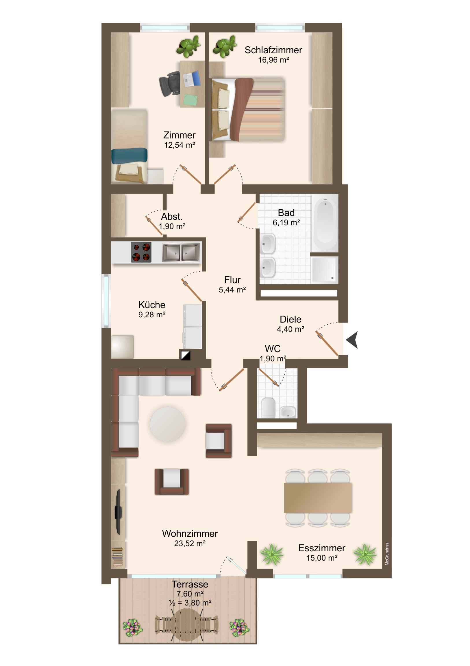 Diese großzügige 3,5- bzw. 4-Zimmer-Erdgeschosswohnung bietet eine Wohnfläche von ca. 101 m² und einen einladenden, funktionalen Grundriss, der perfekt für Familien geeignet ist. Ergänzt wird sie durch eine sonnige, ruhig gelegene Südterrasse. Das lichtdurchflutete Wohnzimmer mit integriertem Essbereich und einer großen Fensterfront sorgt für eine angenehme Atmosphäre und lädt zum Entspannen ein. Dank der Süd-Ausrichtung und dem Zugang zur schönen Terrasse, die zusätzlichen Raum für erholsame Stunden im Freien bietet, können Sie sich auf viele sonnige Tage freuen. Die helle, geräumige Küche bietet genügend Platz für gemeinsames Kochen und ist ideal für Hobbyköche. Angrenzend daran befindet sich eine praktische Speise- bzw. Abstellkammer. Das Schlafzimmer ist großzügig geschnitten und ermöglicht zahlreiche Gestaltungsmöglichkeiten. Ein weiteres Zimmer mit ca. 12 m² eignet sich hervorragend als Kinderzimmer oder Büro. Ein separates Gäste-WC sorgt für zusätzlichen Komfort.